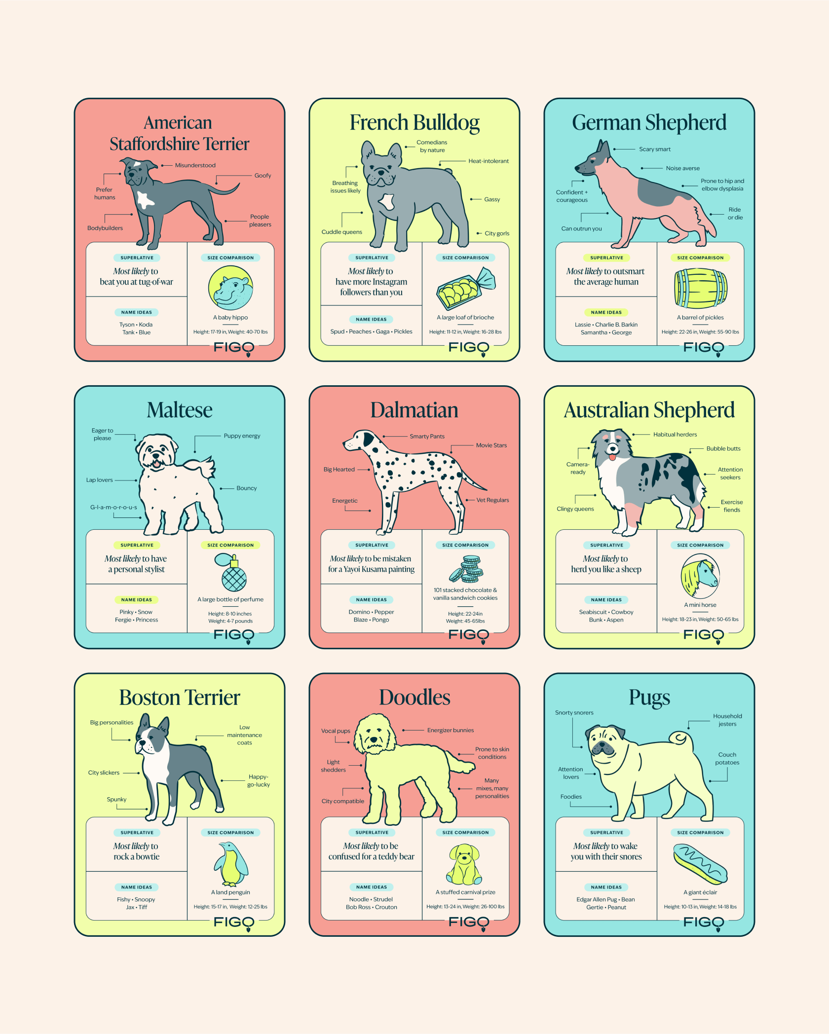 Designing for social media and blog content at Figo means creating work that’s engaging, on-brand, and built to perform. From illustrated posts to breed guides, each piece is crafted to connect with our audience and stand out in the pet insurance space. I also illustrate and animate custom branded GIFs for Instagram Stories, adding interactive, shareable elements that boost engagement.