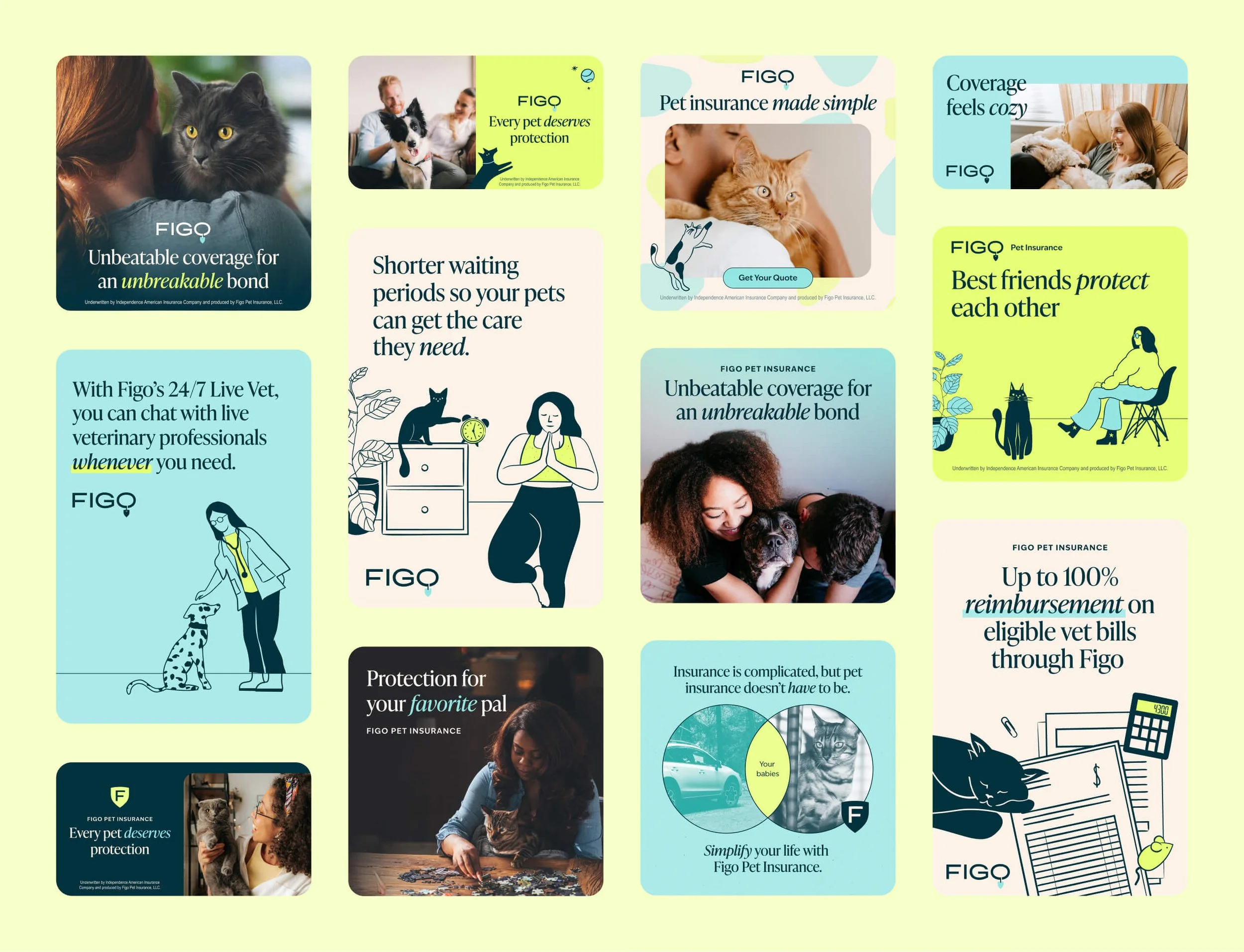 Figo’s brand is centered around highlighting the unique bond between pets and their owners, and we ensure this message is at the core of every asset, both in design and voice. Whether working on large-scale campaigns or creating evergreen ads, each piece is crafted to showcase our coverage while celebrating the joy of pet ownership.