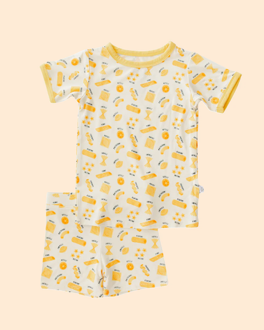 This pasta pattern transforms a favorite comfort food into a playful print. I illustrated noodles like farfalle, fusilli, and penne, pairing each with its name for a design that’s both whimsical and a little educational. Set against a simple cream backdrop, the neatly arranged forms bring clarity and charm, making the pattern ideal for cozy products like baby sleepwear.